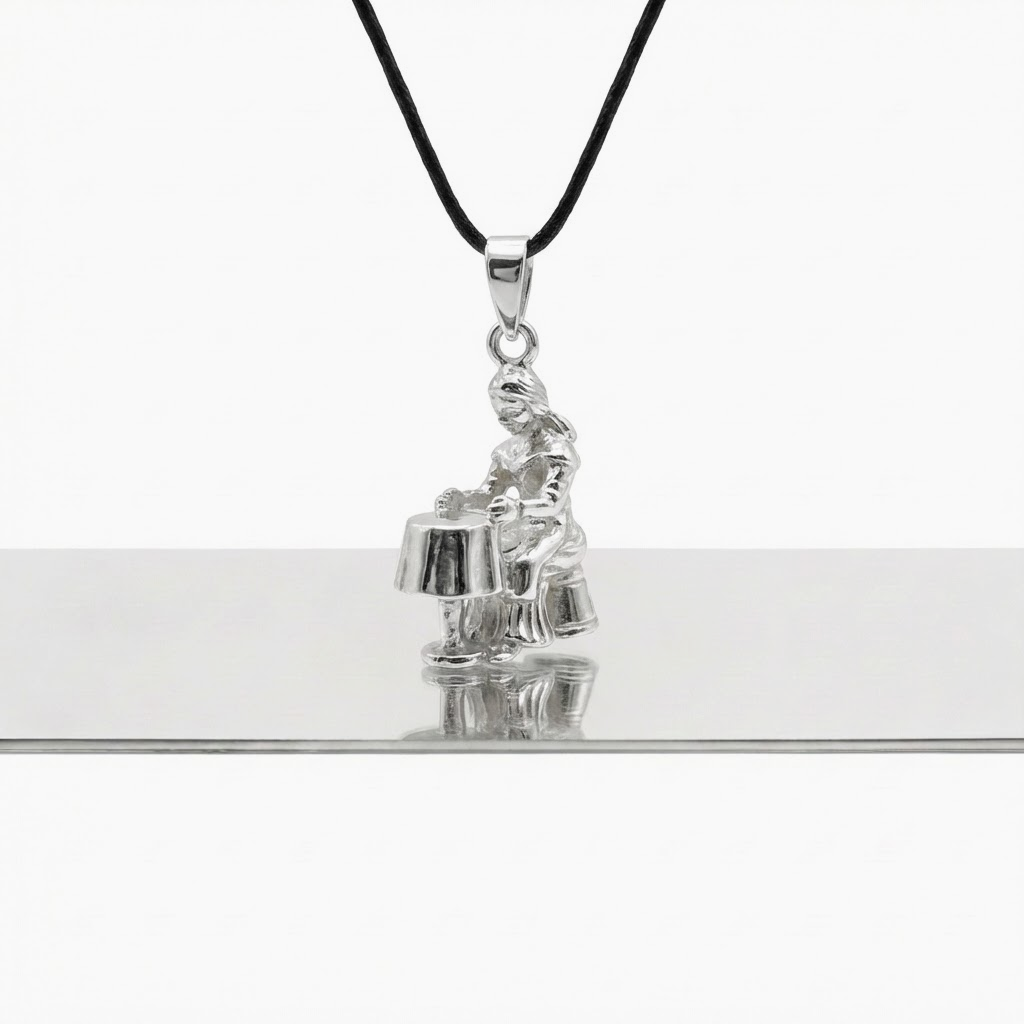 A rediscovered mid-20th century silver charm depicting a seated fortune teller at a draped round table. This original artefact has been translated into a pendant and suspended on cotton cord. Surface cleaned. Attachment secured.