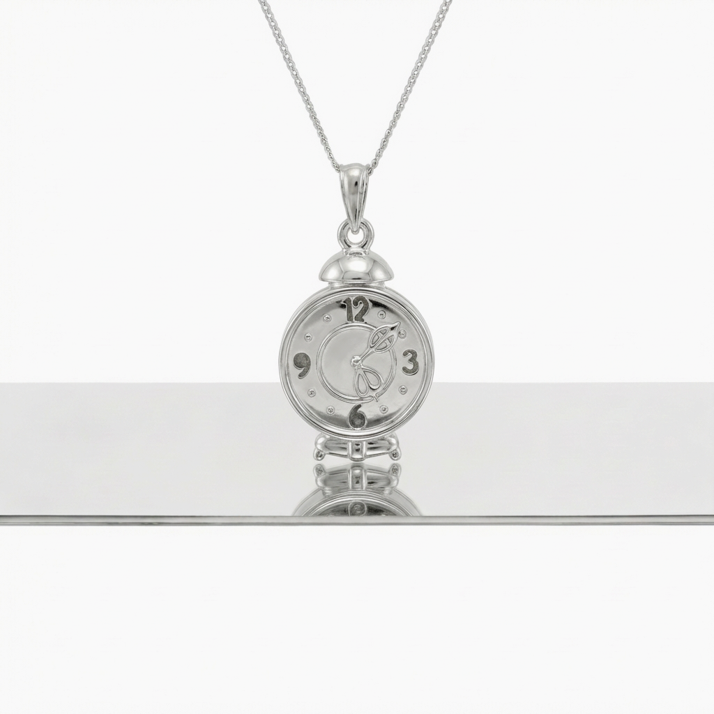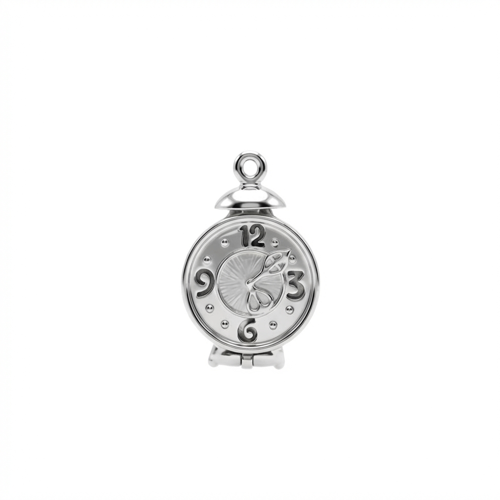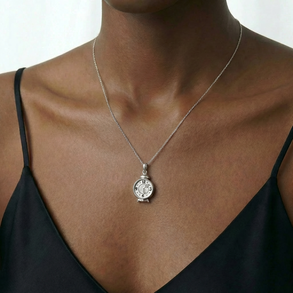 A rediscovered mid-20th century silver mechanical charm in the form of a bedside alarm clock. The hinged clock face opens to reveal a concealed interior designed to hold a miniature photograph. This original artefact has been translated into a pendant and suspended on a diamond-cut trace chain.